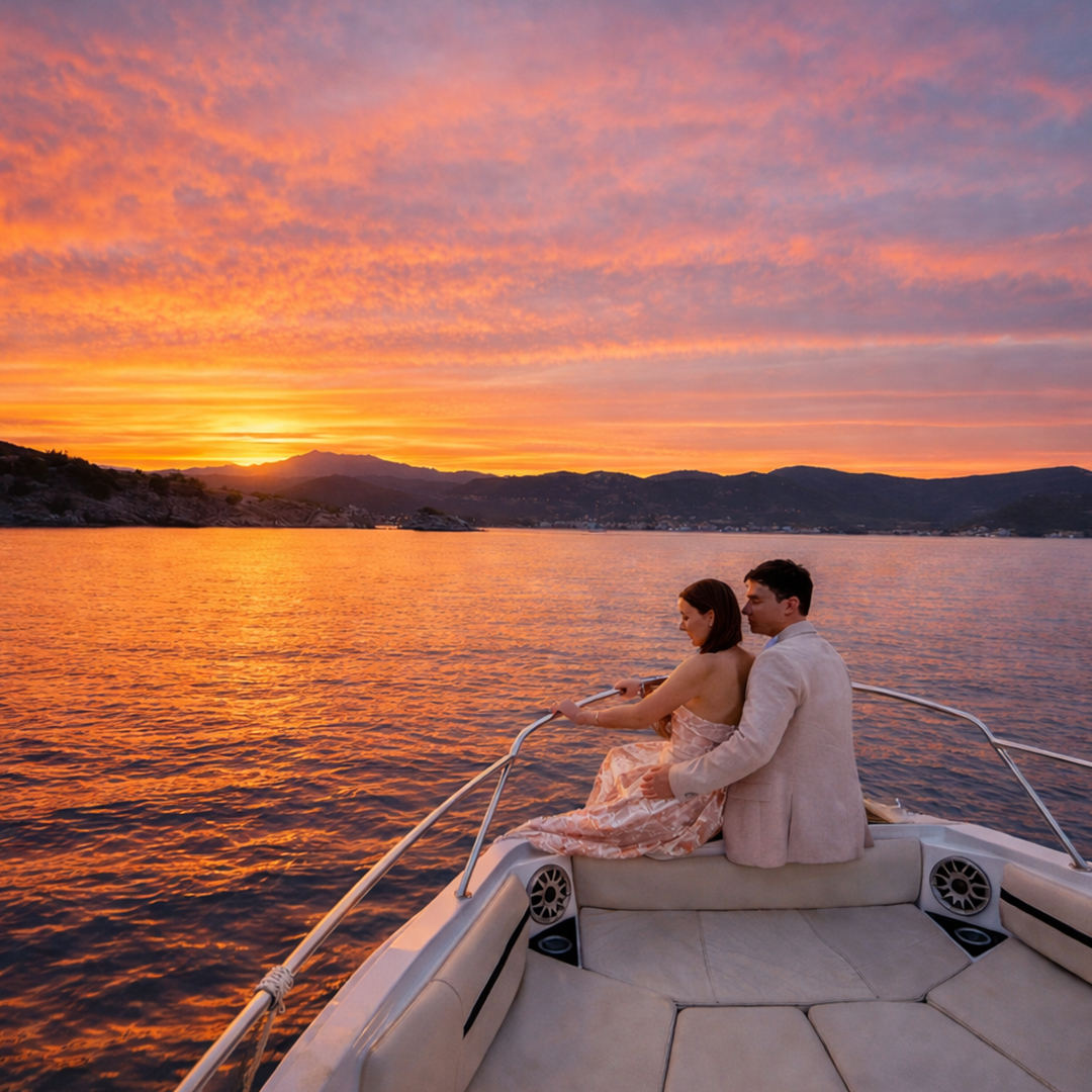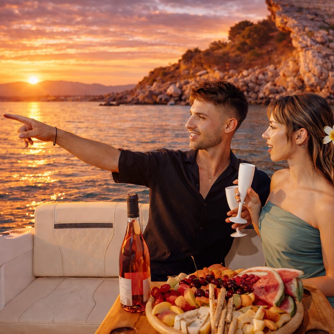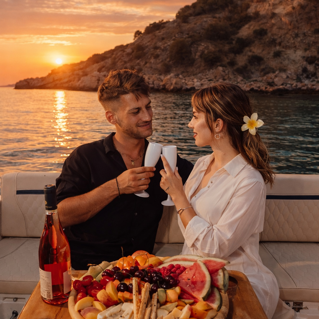 As the sun slowly sinks into the sea, the sky ignites with warm, radiant colors, casting a magical glow over the water and surrounding landscape. Enjoy chilled wine and fresh local fruits offered on board, gently enhancing the romance as the waves whisper beneath you.