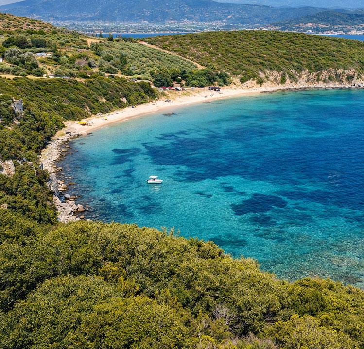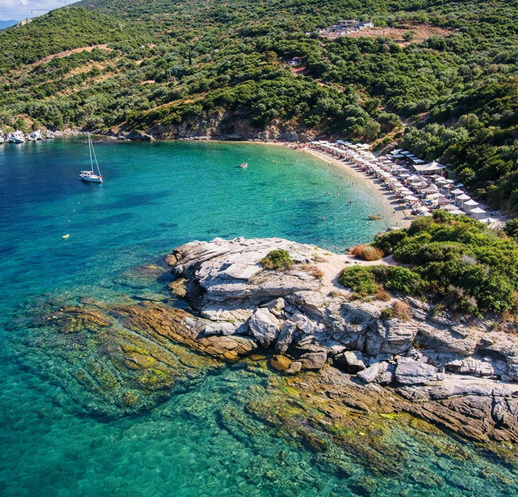 Located between Ammolofoi and Nea Peramos, the Vrasidas Peninsula features small beaches and sheltered coves set against green hills and rocky formations. At its tip, Vrasidas Beach offers shallow, clear waters and fine sand in a calm natural setting