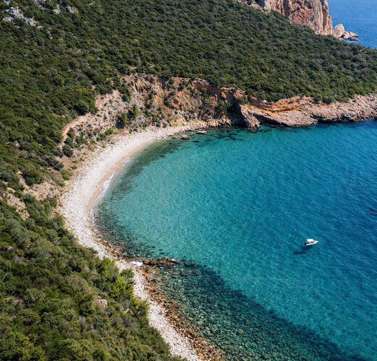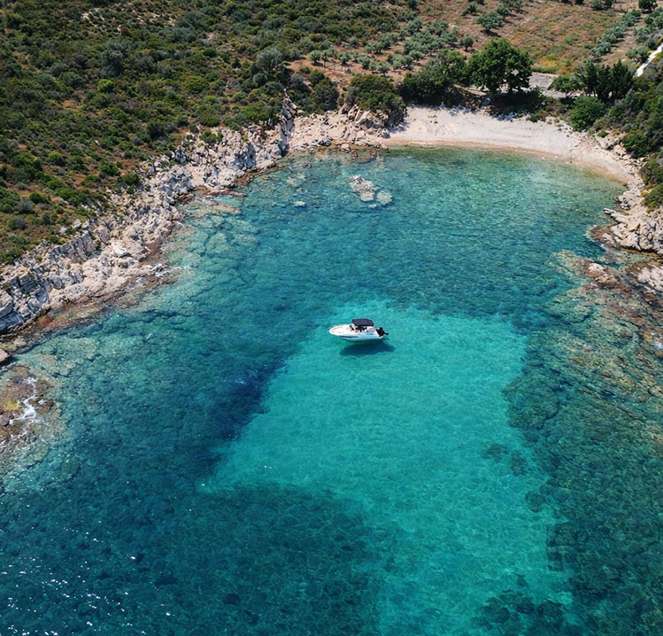 Elies Beach is known for its unique seabed formation, creating the illusion of boats floating above the water. The cove is approached through its center, as reefs extend along both sides